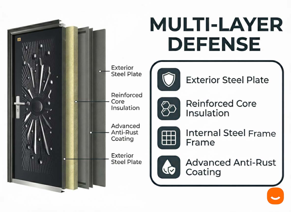 Our security doors redefine home security with their superior multi-layered steel plate structures.