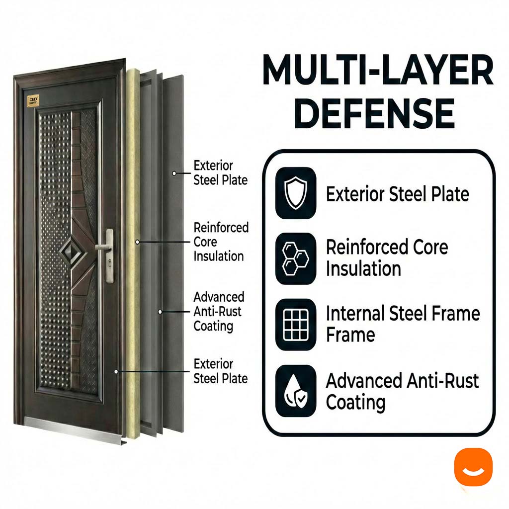 Our security doors redefine home security with their superior multi-layered steel plate structures.