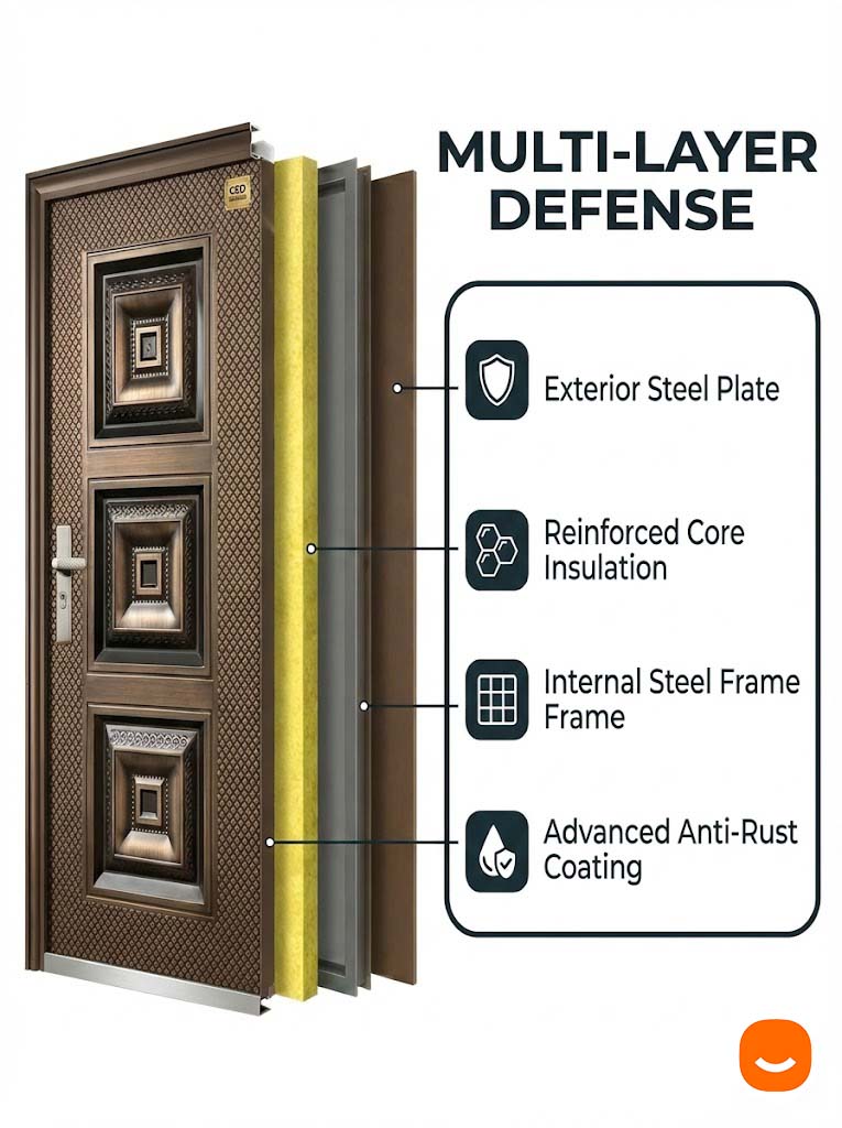 Our security doors redefine home security with their superior multi-layered steel plate structures.