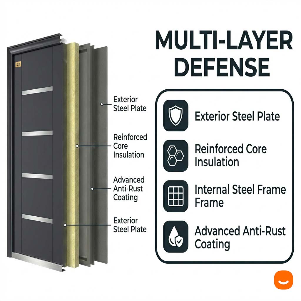 Our security doors redefine home security with their superior multi-layered steel plate structures.